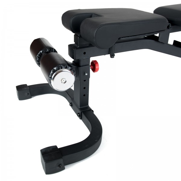 Le dossier, très long, garantit un bon maintien, même pour les sportifs de grande taille. Le dossier est plus large en bas et se rétrécit vers le haut. Cela permet d’apporter un gain de place au niveau des épaules et de couvrir une gamme complète de mouvements. Le banc d’entraînement dispose par ailleurs de rouleaux rembourrés avec quatre niveaux de réglages en hauteur afin de compléter votre entraînement par des exercices abdominaux. Les rouleaux rembourrés peuvent être démontés entièrement s’ils vous gênent.