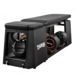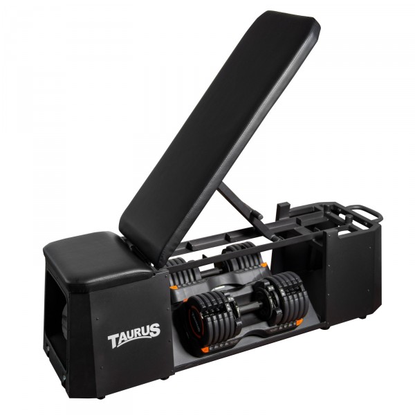 - Banc de musculation prévu pour ranger vos haltères Taurus Selectabell et d’autres accessoires (bande de résistance, tube de résistance) – Attention : seuls les haltères Selectabell de 22,5 et 25 kg peuvent être placés sous le banc
