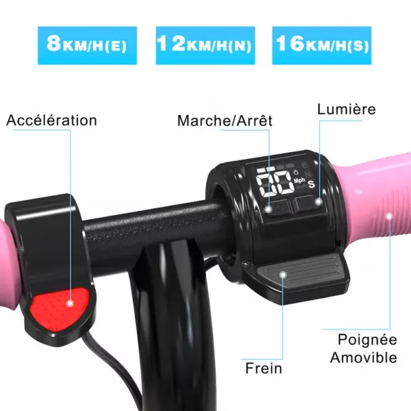 Cette trottinette électrique est idéale pour les enfants âgés de 8 à 12 ans, offrant une expérience de conduite amusante et sécuritaire pour cette tranche d’âge.