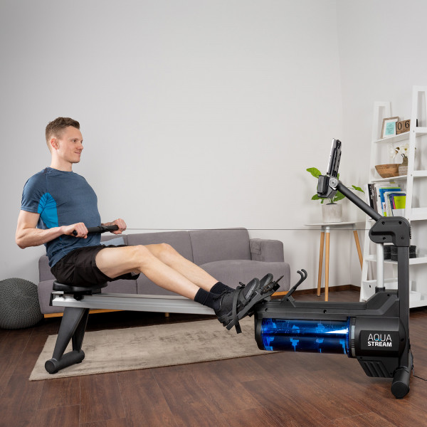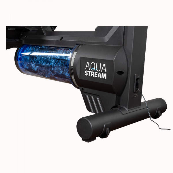 L’Aquastream est un rameur avec résistance à eau. Mais là où d’autres rameurs à eau possèdent un réservoir vertical, celui de l’Aquastream se trouve sous l’appareil. Cela offre une sensation plus fluide et une utilisation extrêmement silencieuse. À cela s’ajoute une excellente console avec des programmes variés ainsi que la possibilité de se connecter à des applications.