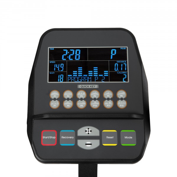 • Affichage : temps, distance, vitesse, watts, tours/min, calories, fréquence cardiaque